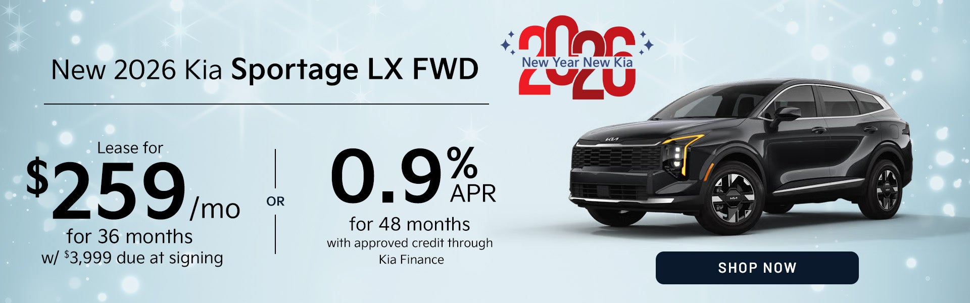 $3,999 due at signing including $259 first monthly payment, $3,090 capitalized cost reduction, $650 acquisition fee, plus tax, title, license and registration fees. Available to well-qualified lessees who lease a 2026 Sportage (Model #42222). No security deposit required. Purchase option at lease end $19,889.10. Subject to credit approval by Kia Finance. Lessee responsible for insurance, maintenance, repairs, $0.20 per mile over 10,000 miles/year, excess wear, and termination fee of up to $400. Offers may not be combined except where specified. Must take delivery by 02/02/2026. See dealer for details. $21.22 per month per $1,000 financed at 48 months. APR financing subject to credit approval by Kia Finance America (KFA), through KFA, for well-qualified buyers and not available on balloon financing. Only a limited number of customers will qualify for advertised APR. New vehicles only. Offers may not be combined. Offer expires 02/02/2026. See dealer for details.